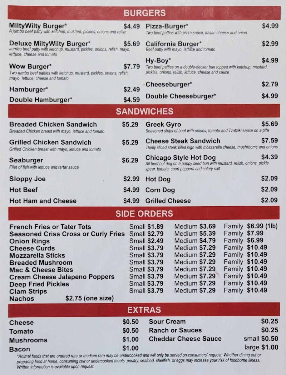 The menu at Milty Wilty Drive-In offers a straightforward, casual selection that complements its nostalgic, laid-back atmosphere. It’s the kind of place where simple, satisfying foods and comforting drinks feel just right whether you’re grabbing a quick bite or settling in for a relaxed afternoon.